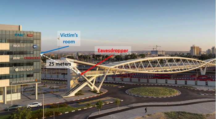 竊聽者位于一座人行天橋上,定位在距離目標(biāo)辦公室25米的空中距離。本部分描述的實(shí)驗(yàn)是使用三個不同透鏡直徑(10,20,35 cm)的望遠(yuǎn)鏡進(jìn)行的。